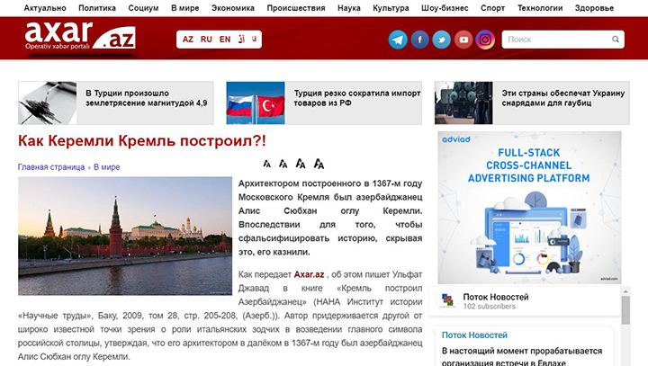 Вот, например, портал Axar.az (фото 1) пишет об азербайджанском происхождении Кремля. Автор статьи ссылается на некоего «историка» Ульфата Джавада, автора издания «Кремль построил азербайджанец».