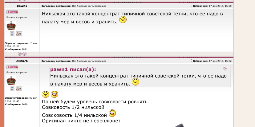 Не обижайте советских тёток. Не все они такие. Нильская куча напомнила мне идейную комсомолку из «Стиляг». Такая же идейно-уперто-горласто-дурная. И мстительная. Только спившаяся с горя, что ей попользовались и бросили. «Там женщины ищут, но находят лишь старость, Там мерилом работы считают усталость».