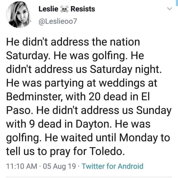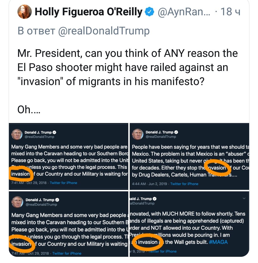 Glebz писал(а): Maribella писал(а): Никого не интересуют твои вопросы Это только показывает что на жертв расстрелов вам на самом деле глубоко насрать. Это твоему президенту наплевать, а также имеет огромное значение, как выражает свои мысли президент, просто потому что он имеет огромное эмоциональное влияние на очень многих людей. В особенности на людей со слабой или искаженной психикой. Они могут рассматривать его как role model or even messiah figure. И кто-то будет утверждать, что президент может нести с подиума или через Твитер ( в особенности через Твитер) что угодно в какой угодно форме? Этот убийца псих, которому, может быть, только и нужен был небольшой толчок. И он мог получить этот толчок from the person who occupied БД... Кроме того,видно, что нынешнему так было все безразлично , что он даже перепутал Dayton c Toledo так как даже не вникал, где это происходило, что даже текст заранее написанный на экране и то не помог сказать правильно