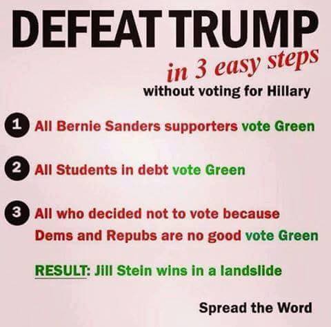 Джил- достойный кандидат, но отдавая свой голос ей сейчас, это значит отдавать в никуда.Трампу только на руку, если вы не хотитет его.Клинтон-слабый кандидат, хоть и впереди Трампа на 6 поинтов, как показывает пул. Если бы я была уверена, что Джил победит, безусловно голосовала бы за нее. Но у нее всего 3%.Ее время не пришло..чтобы победить,ей нужна система, при которой все кандидаты будут в равных условиях. Она не биллионер Трамп и не под крылом лобистов, чтобы спонсировать себе компанию, многие даже не знают о ней ничего, поэтому и не голосуют.. К сожалению, приходится выбирать из тех, кто впереди гонки. Уверена, что к следующим выборам о ней будут знать больше людей. Florence писал(а): Трамп тупой, без опыта и вообще козёл, и он не будет президентом. Можно успокоиться и голосовать за Зелёных, за Джил Стайн. Не будет вам Трампа, понимаете? Не надо нервничать. Голосуйте за кандидата, который соответствует вашим убеждениям. Don't waste your vote - vote Green.