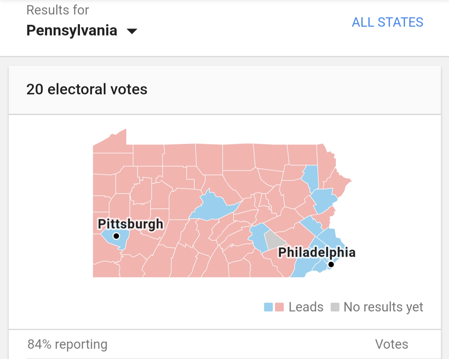 Eugenia писал(а): Artemida писал(а): Татиана_1 писал(а): В Ра тоже ноздря в ноздрю Очень за Пенсильванию переживаю, но она исторически демовская. Филадельфия, а деревня вся усыпана синими табличками с трампом Почти весь штат розовый