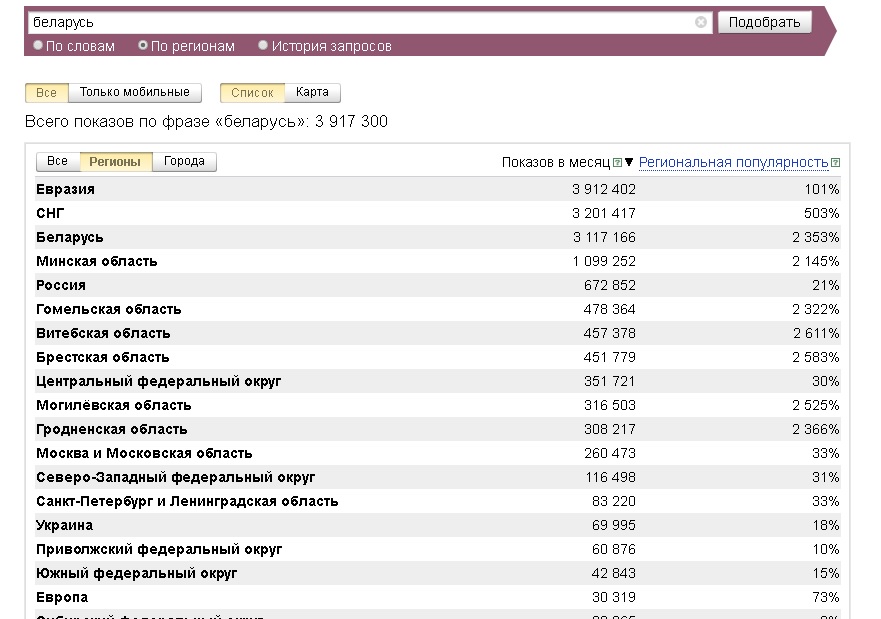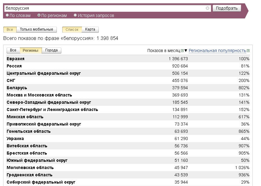 SantaMonica писал(а): Война писал(а): SantaMonica писал(а): "республика беларусь" используют. Ну там же уже все даже расписанно.  Республика Беларусь- 240 т запросов в месяц. Так что не тяните осла за уши, ну статистику в смысле. Большинство россиян как раз используют Беларусь. Не "запросов", а "показов" в месяц. Цитата: «Показов в месяц» - это абсолютное значение количества показов страниц по запросам из данного региона." Цитата: статистика Яндекса не предоставляет данные о количестве людей, совершавших поиск по конкретным запросам, она лишь выдает число показов результатов поисковой выдачи, содержащих этот запрос. Цитата: цифра, которая стоит сверху запроса включает в себя все ключевики, содержащие сам запрос и его словоформы. Следует использовать специальные операторы. Мне сейчас на "беларусь" российский яндекс выдал белорусские сайты, которые, естественно, в те 4 млн показов и включены.  Объясняю. Если ты будешь набирать каждые день в яндексе- беларусь, республика беларусь, беларусь синеокая, где купить в беларуси трактор и тд, то все эти словосочетания пойдут в статистику по слову БЕЛАРУСЬ. Однако яндекс не дает информацию о количестве людей, котоыре это ищут. То есть, один человек может искать какие то словосочетания со словом беларусь 100 раз в день и яндекс засчитает это за 100 раз, а не за одного человека. https://ru.wikipedia.org/wiki/%D0%A1%D1 ... 0%BE%D0%B2 И да, сайты из РБ показываются ( естественно), так же как и сайты из других регионов. Но это именно статистика по запросам. Вот прямо из яндекса скопировала В результатах подбора будет приведена статистика запросов на Яндексе, включающих заданное вами слово или словосочетание (слева), и других запросов, которые делали искавшие его люди (справа).