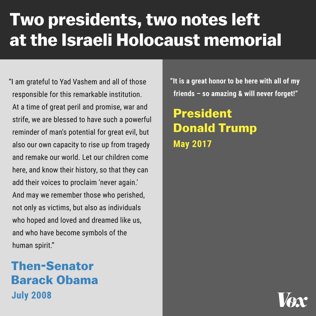 The contrast between Obama and Trump’s notes at Israel’s Holocaust memorial is striking: Ps And here's what Secretary Hillary Clinton wrote on her visit in 2009: "Yad Vashem is a testament to the power of truth in the face of denial, the resilience of the human spirit in the face of despair, the triumph of the Jewish people over murder and destruction and a reminder to all people that the lessons of the Holocaust must never be forgotten," Clinton's note said. "God bless Israel and its future." Ох, Трампуся, это все что ты можешь сам написать?  как на развлечение сходил