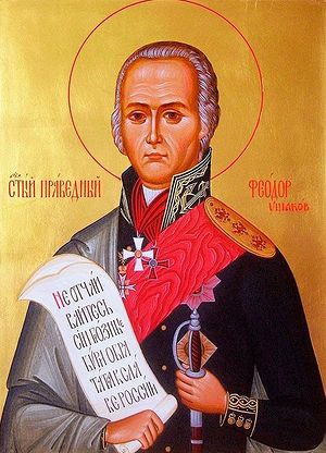 Слова на свитке на иконе Ушакова: « Не отчаивайтесь! Сии грозные бури обратятся к славе России»
