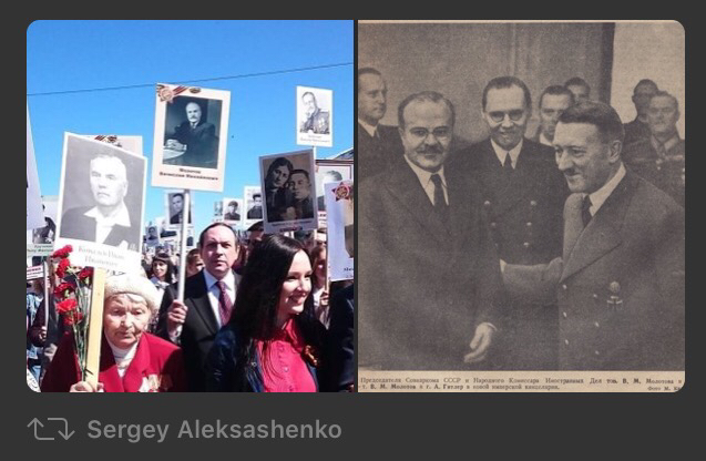 Внук Молотова несет деда в бессмерном полку...в настоящем депутат госдумы.... Про пакт Молотова-Рибентропа все знают где почитать Королевство кривых зеркал