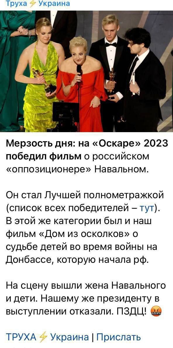 Nicole+ писал(а): Maribella писал(а): Документальный фильм «Навальный» получил премию «Оскар»Политический байопик «Навальный» канадского режиссера Дэниэла Роэра получил премию «Оскар» в категории «Лучший документальный фильм». Получать премию на сцену театра Dolby в Лос-Анджелесе вместе с режиссером поднялась семья Алексея Навального — его жена Юлия Навальная, дочь Дарья и сын Захар. Обращаясь к залу со сцены Юлия Навальная сказала: «Мой муж в тюрьме только за то, что говорил правду. Мой муж в тюрьме только за то, что защищал демократию. Алексей, я мечтаю о дне, когда ты станешь свободным. И наша страна станет свободной. Держись, моя любовь». Роэр поблагодарил семью Навального за мужество, поблагодарил расследователей Христо Грозева и Марию Певчих, и посвятил свою награду российскому оппозиционеру. «Я бы хотел посвятить эту награду Алексею Навальному и всем политическим заключенным во всем мире», — сказал режиссер.   Спасибо за инфу, Марибелла! Наконец-то вспомнили!  Сегодня Бужанского почитала, дак ой как разобиделся , что УкрAину обделили...Никакого сочуЙствия АЛЕШЕНьКЕ НАШЕМУ...