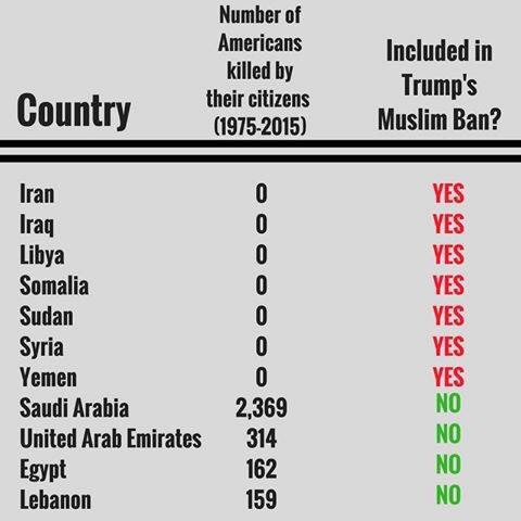 По моему.эта табличка говорит сама за себя...те страны, с которыми есть бизнес и диктуют ситуацию на рынке нефти не пострадали, но все мы знаем террористов из Саудовской Аравии...что за смысл в этом бане, если мусульмане живут и в Европе и и имеют там гражданство; 35 тыс беженцев в прошлом году приняла Канада, ну а с ней граница совсем не на замке...в чем смысл всего этого- направить недовольство жизнью всех простых мусульман против Америки? Не президент, а сплошной популист..