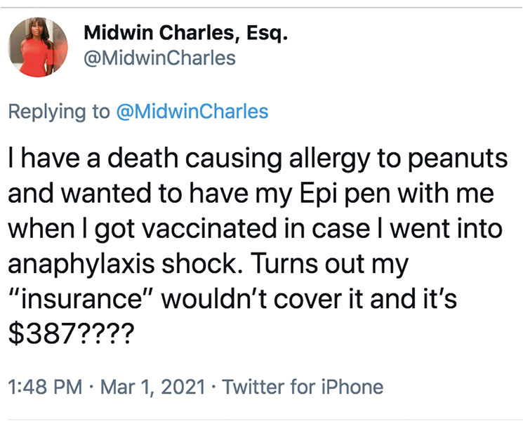 Strawberry писал(а): mrv71 писал(а): Не будет, на Пфайзер никто не жаловался. Посмотрим что с вами будет через 6-12 месяцев, это как раз начало проявления всех побочных явлений, рак одна из побочек. Вы тут еще говорили что это ложь что страховые отказывают в покрытие, выходит что нет...они не покрывают если у вас случилась реакция на вакцину, как случилось у этой CNN контребьютор. Midwin Charles, CNN Legal Contributor, Dies After Getting mRNA Vaccinehttps://sandrarose.com/2021/04/midwin-charles-cnn-legal-contributor-dies-after-getting-mrna-vaccine/  Она не от вакцины умерла - вы оригинал вообще читали??? https://www.today.com/popculture/msnbc-legal-analyst-midwin-charles-dies-47-t214314 https://deadline.com/2021/04/midwin-charles-dead-obituary-cnn-msnbc-legal-analyst-was-47-colleagues-pay-tribute-1234729429/ Her death was announced by her family on social media. A cause of death and other details were not specified.Никакой реакции на вакцину у неё не было вообще, кроме как рука немного болела - вы вообще по-англ. читать умеете?  Она писала про то, что её страховка не покрывает её прибор от аллергий, а причем здесь вакицна?? Это проблема её и её страховки, одни покрывают, а другие нет. У неё не было никакой аллергии от вакцины, не сочиняйте.