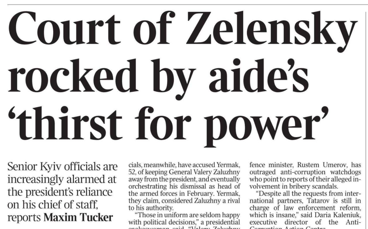 А вот это ооооочень интересно! Газета The Times публикует сегодня неприкрытый наезд на Андрея Ермака, главу офиса президента Украины. Причем обращаю внимание, что автором этого опуса является Максим Такер, тесно работающий с главой ГУР Кириллом Будановым и постоянно прославляющий (https://t.me/kornilov1968/24350) того. Из чего можно предположить, что Буданов открыто выходит на тропу войны против Ермака.