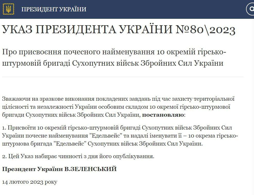 "Присвоить 10 отдельной горно-штурмовой бригаде Сухопутных войск Вооруженных сил Украины почетное наименование "Эдельвейс" и в дальнейшем именовать ее 10-я отдельная горно-штурмовая бригада "Эдельвейс" Сухопутных войск Вооруженных сил Украины", - говорится в тексте указа Зеленского, опубликованного во вторник на его сайте.