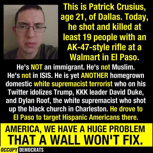 Последние новости: показали дом стрелка, и он из очень-очень богатой семьи, и также он опубликовал в интернете расистский манифест, в котором повторяется риторика Трампа, в сущности, все, что он говорит и пишет в Твиттере об иммигрантах: https://www.msnbc.com/msnbc/watch/manif ... gLPfcb0RYU