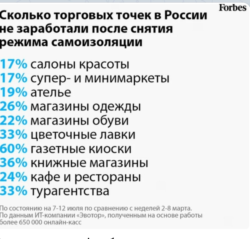 " Вот, граждане, Форбс оптимистично докладывает нам, что закрылся каждый 5-й бизнес в России. Остальные, очевидно, пока живут на отложенном спросе, ну а дальше... Будут сокращения в госсекторе, который у нас около 65% (видимо уже больше) от всей экономики. Отложенный спрос, пока все гуляют и лето скоро закончится. У людей станет еще меньше денег, хотя их и сейчас уже совсем мало, а падение покупательской способности это путь, сами знаете куда... "