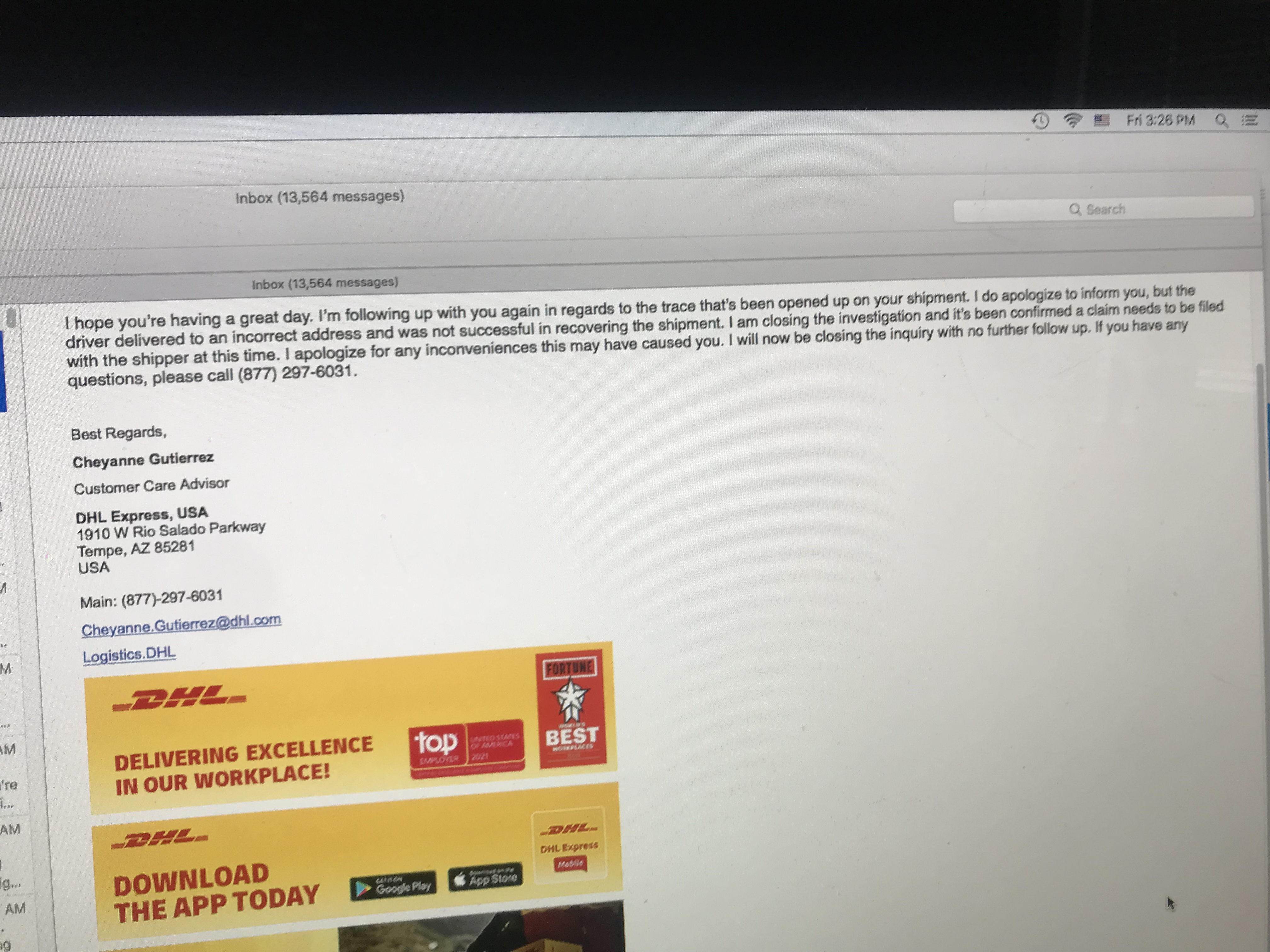 А вот еще эпопея. Посылку не смогли оставить. Доставили первый раз по другому адресу, сказали им, что мы ничего не получили. Они нашли куда доставили, забрали и сказали в пути к вам. И снова доставили не туда! Но в этот раз они не могут забрать посылку у того, кто ее взял. Они нам сообщили, что сделали три попытки ( три раза ездили по тому адресу) забрать посылку и безуспешно. Там либо не открывают дверь либо их нет дома. Письмо им было на двери оставлено, чтобы вернули посылку - но вот уже две недели - тухлое дело. Я открыли комплейн на водителя DHL. Такая некомпетентность просто диву даешься.