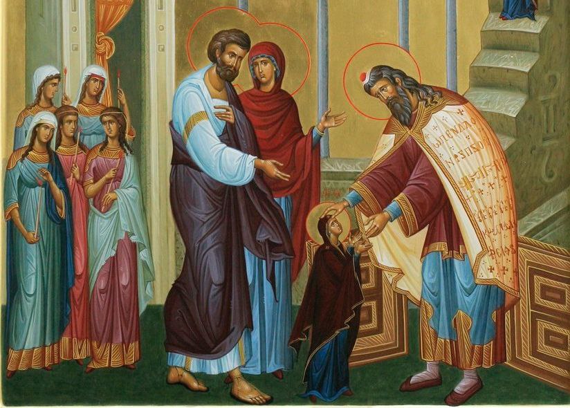 4 декабря – праздник Введения во храм Пресвятой Богородицы. В этот день святые Иоаким и Анна привели Деву Марию в Иерусалимский храм, где она впоследствии служила. Икона отмечаемого 4 декабря праздника Введения во храм Пресвятой Богородицы наполнена глубокими смыслами и многими планами, на которые мы порой не обращаем внимания... В праздничных иконах «Введение во храм» и «Сретение» развиваются идеи совместного – семейного предстояния и служения Богу. Композиции образов сходны: синхронные «отдающие» и одновременно оберегающие жесты рук и склоненное положение фигур родителей, смиренно отдающих Чадо в дар Всевышнему.