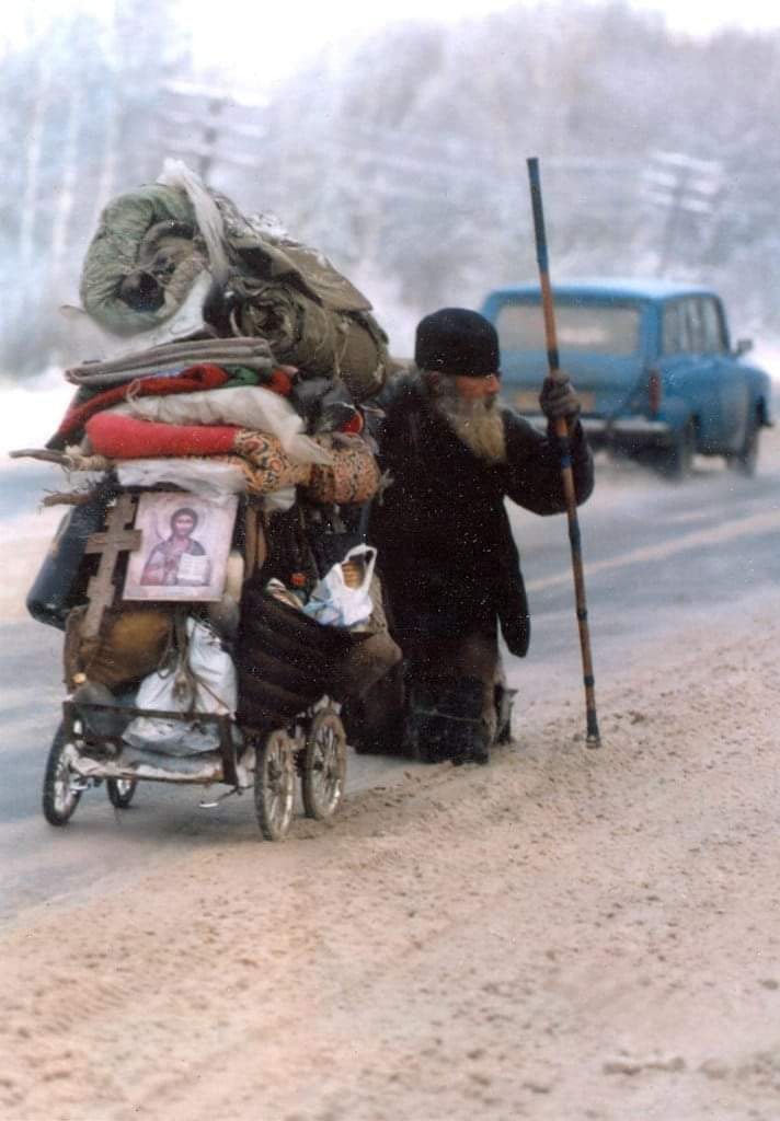 Кто-то подаёт ему еду, просит помолиться о близких. Кто-то смотрит на него с любопытством, кто-то – с состраданием. Одна старушка пытается помочь подтолкнуть медленно ползущую тележку. Некоторые откровенно подсмеиваются над чудаком.