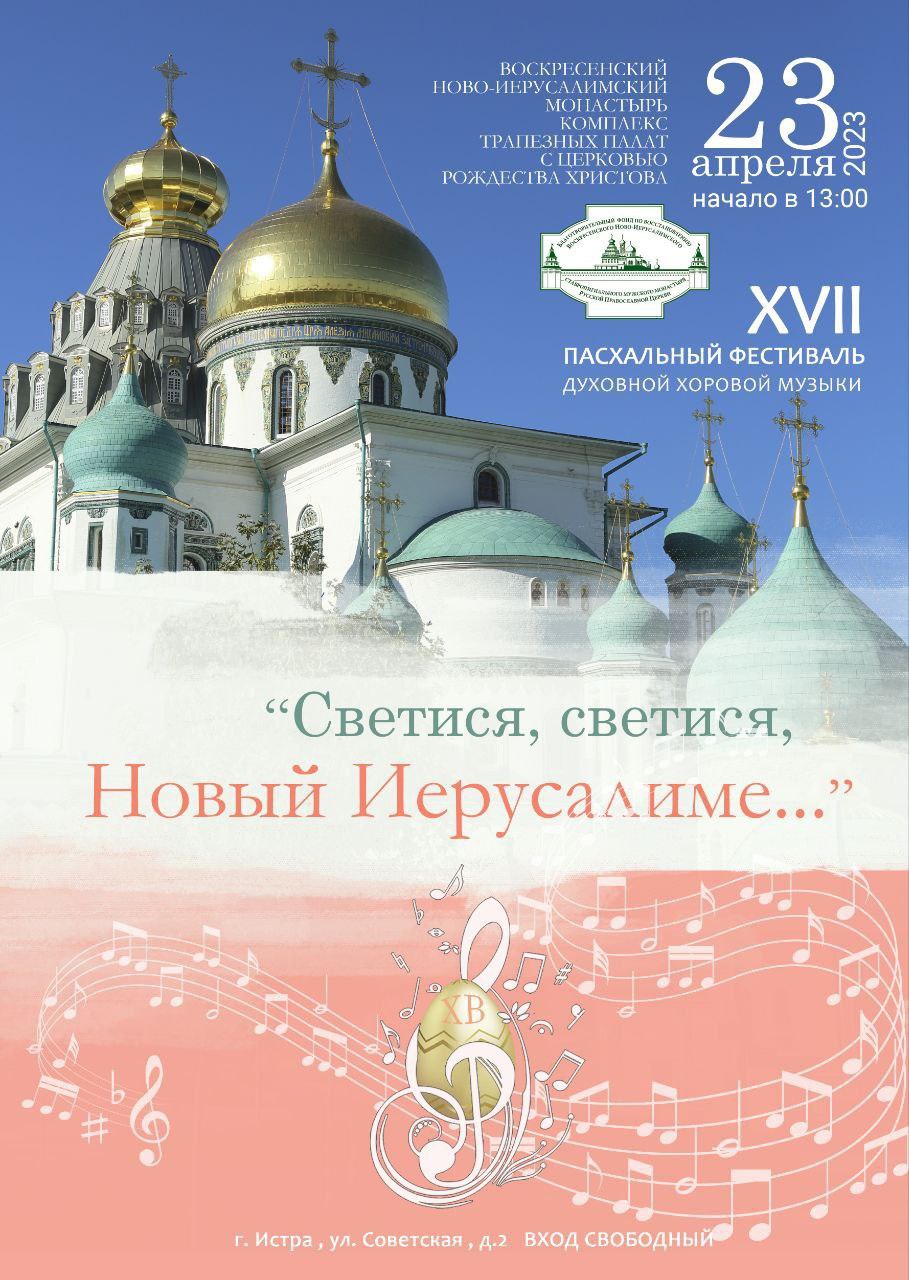 23 апреля 2023 года в 13:00 в комплексе Трапезных палат Ново-Иерусалимского монастыря при поддержке Благотворительного фонда по восстановлению Воскресенского Ново-Иерусалимского монастыря состоится XVII Пасхальный фестиваль духовной хоровой музыки «Светися, светися, Новый Иерусалиме...». Вход свободный, приглашают всех желающих.