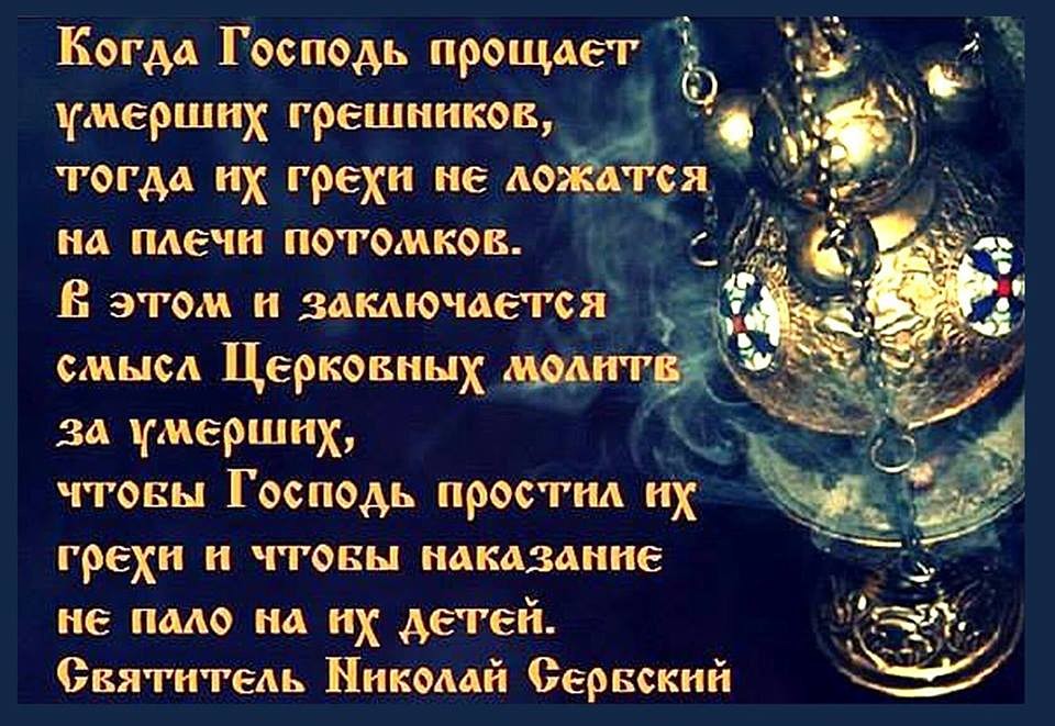 Почему особо выделяются 3-й, 9-й и 40-й дни после смерти? Душа человека до 3 дня находится рядом с его родными, с 3 по 9 день ей показывают загробный мир, а с 9 дня — особо тяжелый период для души умершего, она идет по мытарствам, где познает все свои грехи. Наконец, в 40 день оканчиваются мытарства и душа снова возносится Ангелами на поклонение Богу, Который определяет ей соответствующее место в ожидании Страшного Суда по ее земным делам, духовному состоянию и по благодати молитв Церкви и близких. В этот период (с 9 по 40 день) родные должны особо молиться. Опять же читается Псалтырь, в храмах имя человека поминают в заказных записках. Очень желательно в 3-й, 9-й и 40-й дни служить панихиду. Воздушные мытарства — название препятствий через которые должна пройти душа каждого христианина на пути к престолу Бога для частного суда. Пройти мытарства душа сможет в том случае, если человек вел праведный и благочестивый образ жизни. По этому пути душу ведут два ангела. Каждым из мытарств, число которых 20, управляют бесы — нечистые духи, пытающиеся забрать проходящую мытарства душу в ад. Бесы предоставляют список грехов, относящихся к данному мытарству, а ангелы — добрые дела, совершённые душой при жизни. В случае, если добрые дела перевешивают злые, душа переходит к следующему испытанию. Если злые дела перевешивают добрые и ангелам нечего предъявить для оправдания души, бесы уносят душу в ад. Когда же ангелы представят добрые дела к оправданию души и злые духи припомнят столько же грехов к её осуждению и будет равновесие, тогда побеждает человеколюбие Божие. Список добрых дел ведётся ангелом-хранителем, который даётся каждому человеку при крещении, список грехов ведёт бес, посылаемый сатаной к каждой душе для того, чтобы приводить человека к грехопадениям. 1. Мытарство празднословия. Здесь истязуются те, кто разговаривал сверх меры или на недушеполезные темы, разносил дурную молу о ком-либо. 2. Мытарство лжи. Здесь человек отдаёт отчёт за всякое лживое слово, за неискреннюю исповедь во грехах и за неисполнение данных Богу обетов.