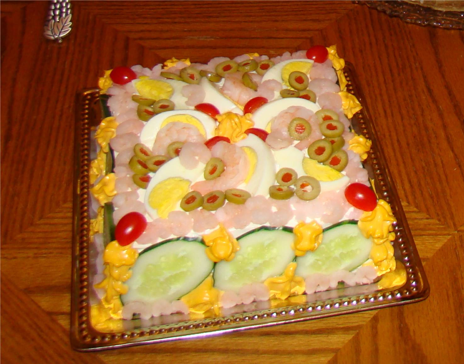 Тогда же делала закусочный торт (бутербродный). Возни много, делать надо за 24 часа до подачи, чтоб пропитался, а украшать перед подачей. Рецепт взяла с голландского кулинарного форума, но, за отсутсвием некоторых ингридиентов, пришлось адаптировать.  Писать лень сейчас, выложу фотку пока.