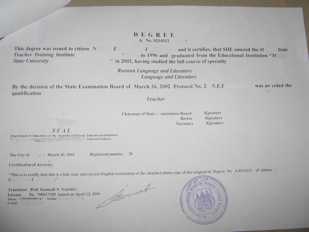 ДЕвочки с Беларуси, помогите пожалуйста образцами перевода аттестата о сред.образовании (1988 г.) и выпиской из зачетной ведомости пед.института им.Горького в основном стандарт.формами шапки и заключительной части.С учебными предметами гораздо все проще.