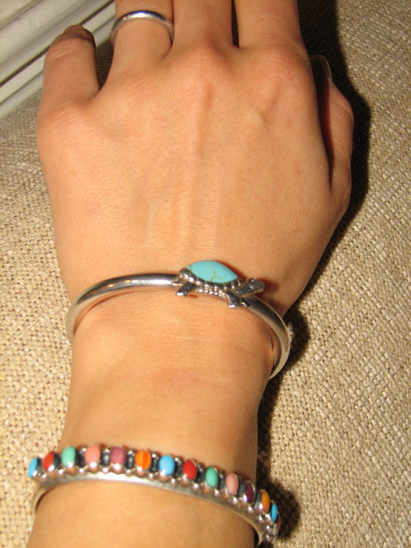 Еще хотела свои любимые браслетики показать. Оба подарил муж, но в разное время. И они так великолепно "совпали". Я их вместе ношу, но на разных руках. Это здесь - по лени своей, чтобы одной фоткой обойтись - на одну руку нацеgила :)))
