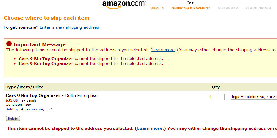 У Амазона шип в др. страны далеко не на все группы товаров. Игрушки, одежду, обувь, мебель и мн. др. не шлют(((