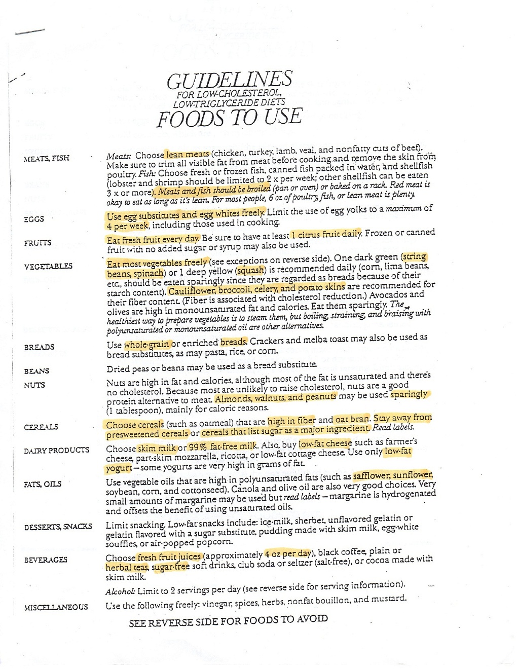 SunnyAKМне врач дал просто бумажку, Guidelines for low cholesterol low-triglyceride diets foods to use. Вот ссылка: http://www.americanheart.org/presenter. ... ifier=4778 Там написано брать белки из lean meat, poultry и в для многих людей 6 oz (170 граммов) мяса достаточно в день. Отсканировала свой листочек специально для форума. P.S. Ладно не смейтесь насчет моего 500 калл снека, не считала в рацион каллорий потому что не ем каждый день, раз в неделю иногда.
