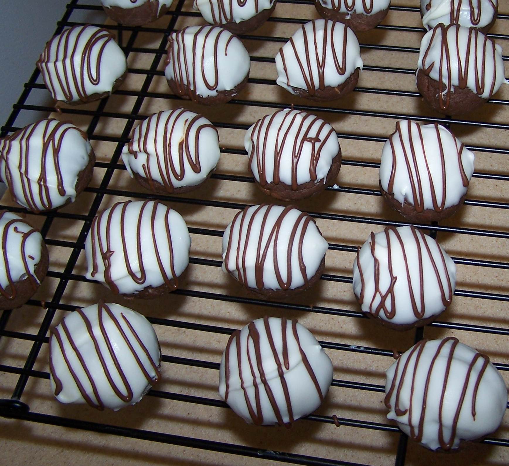 Первые: печенье-трюфель Франжелико, только что закончила. Оооо,Китти,дайте рецепт срочно,плиииз. 4 oz semisweet baking chocolate 1\4 cup butter 1 can sweetened condensed milk 2 tablespoons Frangelico (итальянский ликёр из лесного ореха, везде есть, иногда продают и в малюсеньких бутылочках) 2 1\2 cups all-purpose flour 1\2 cup chopped hazelnuts 1\2 cup white chocolate chips more chocolate for decorating Масло с semisweet baking chocolate растопить в микроволновке (по 20-25 секунда, раза 3), добавить сгущёнку, орехи, ликёр Франжелико, перемешать и вести муку небольшими порциями. Накрыть тесто и остудить 30 минут в холодильнике. Скатать шарики по 25 грамм, выпекать при 350 Ф на сухом противне 7-8 минут - НЕ БОЛЬШЕ! Печеньки будут казаться непропёкшимися, это нормально, они станут более твёрдыми, когда остынут. Остудить 5 мин на противне, потом на cooling rack. Белый шоколад растопить, обмакнуть печенье, дать высохнуть и украсить растопленым коричневым шоколадом.