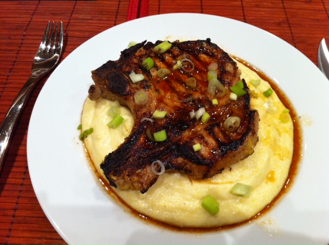 Выкладываем на тарелку поленту, сверху pork chop, посыпаем любимой зеленью (я люблю или зеленый лук или chives). Готово.