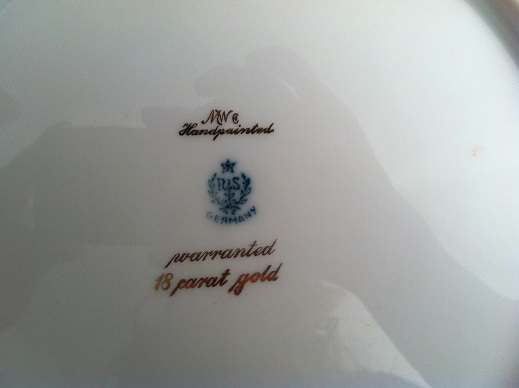 кое что нарыла, но все равно 100% сказать не могу. для меня уже этот проклятый RS дело принципа, прийдется книги по ним покупать и изучать. столько фейков! Во-превых, на ваших тарелках еще есть клеймо MW co. это другая компания. но в период с 1914 по 1945 RS выпускали посуду раскрашенную и нераскрашенную -чисто белую (белье, так называемое ). Цитата: RS Germany is part of the wording in marks used by the Tillowitz, Germany, factory of Reinhold Schlegelmilch from 1914 until about 1945. The porcelain was sold decorated and undecorated. т.е. другая копания могла купить чистые тарелки и расписать, стоимость такой посуды ниже чем посуды расписанной RS. если бы это были тарелки расписанные RS, там бы не было клейма МW. т е в лучшем случае эти тарелки RS периода 1914-1945 гг выпущенные в белье и расписанные в другой компании MW co. но меня смущает, что у RS было несколько другое клеймо в этот период и после слова Germany должна стоять точка. Вот клеймо. может быть и синего цвета тоже, но от вашего отличается. а вот сет этого периода на ebay, который, по моему мнению, настоящий , http://www.ebay.com/itm/ws/eBayISAPI.dl ... 0621146177