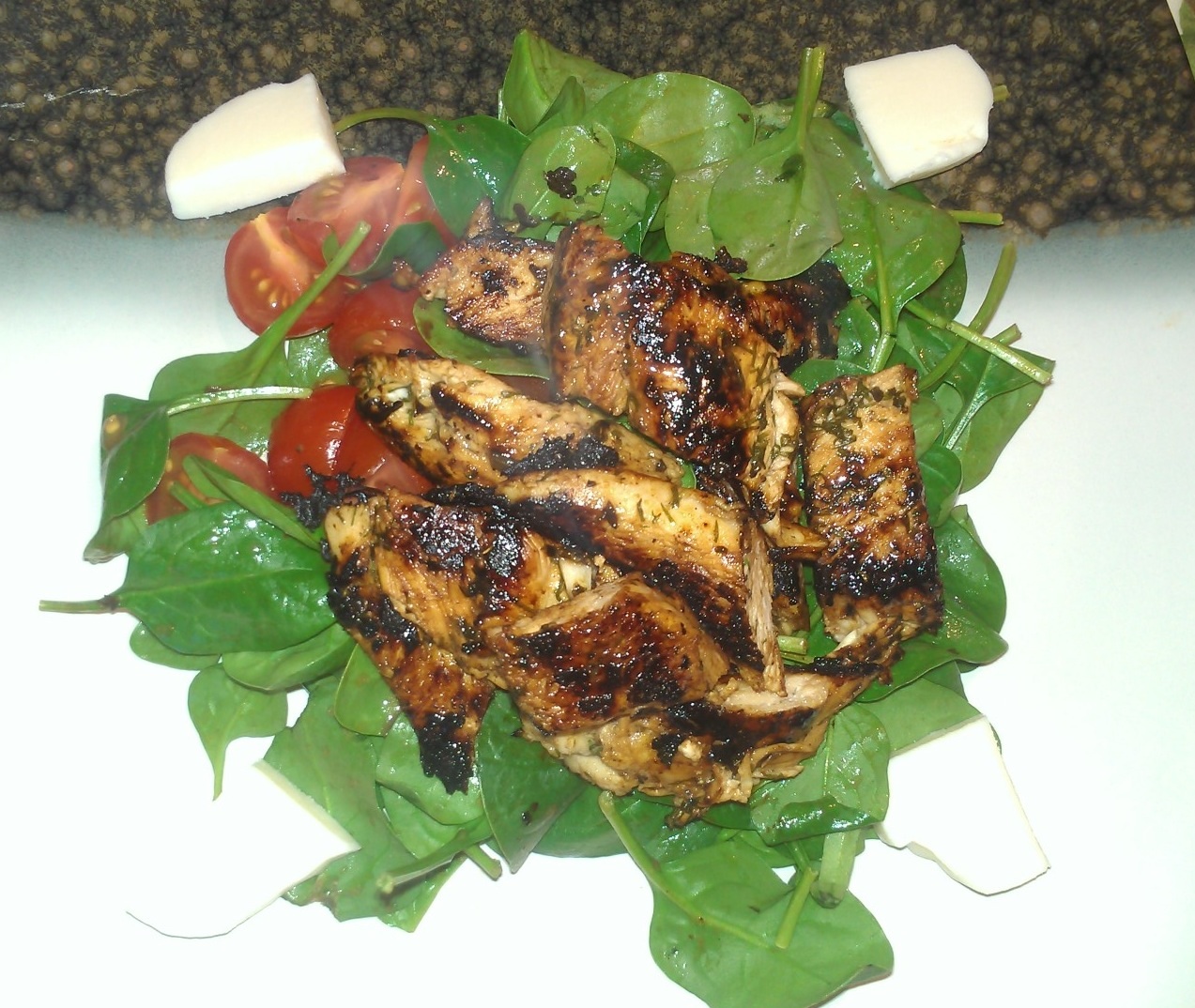 С удовольствием!!! Куриную грудку (у меня одна) режем пополам (тоесть на две тонкие равные части). Маринуем в бальзамическом уксусе, чуть меньше 1/4 cup, лимонный сок 1чайная ложка, масло оливковое столовая ложка, укроп или петрушка (мелко порезанная), чеснок один зубчик, розмарин, соль, перец черный. Оставляем на пол часа, не обязательно в холодильнике можно просто на столе. Готовим беби шпинат, маленькие помидорки, все это брызгаем бальзамическим и оливковым маслом и перемешиваем. Выкладываем на тарелку (я положила чуток сыра моцарыллы вокруг салата). Курицу обжариваем (лучше на сковороде гриль), но можно и на простой, жарим с двух сторон до готовности (смотрите чтобы не подгорела, в бальзамике курица быстро схватывается). Готовую курицу режим на небольшие кусочки и укладываем на салат. Готово!!! Быстро и вкусно