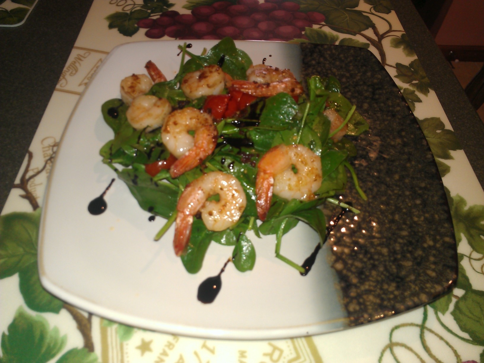 Вот еще сегодняшний мой салатик с криветками и шпинатом (обожаю шпинат) Обжариваем чеснок на оливковом масле чуток, чтобы запах пошел и туда креветки все вместе обжариваем... Для салата, шпинат, чери помидорки. Для заправки, оливковое масло, сладкая горчица, сок лимона. Перемешиваем и выкладываем салат на тарелку, сверху брызгаем Balsamic Glaze (обожаю его) и выкладываем горячие креветки на салат (я выкладываю вместе с маслицем и чесноком на котором все это жарилось). Вкусно и быстро