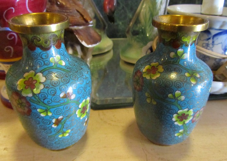 Машинка, зачем с подружками партизанить, почему нельзя прийти в свой же магазин в выходные свои дни и купить? ну не все же сметается именно когда вы работаете. Ну и да, по возможности приныкать в дальние углы. Попалась на глаза красиво иллюстированная статья про китайскую перегородчатую эмаль. Налюбовалась, на цены поохала ну и *опытным глазом* на другой день выцепила вот эти вазочки. Толкьо какие-то они невзрачные...Может и не она вовсе? По 5 баксов хотят. Так и кажется, что больше не стоят