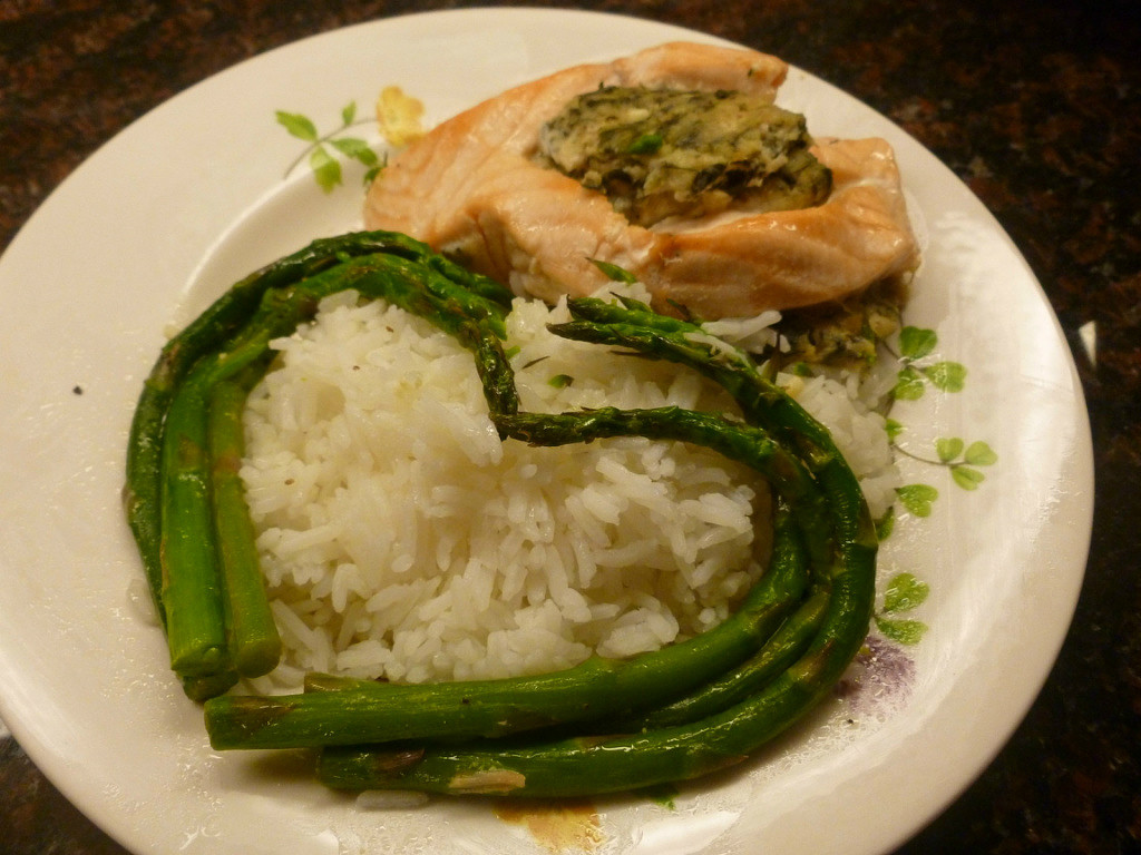 вчерашний ужин  Салмон с фетой и шпинатом ,и аспарагус