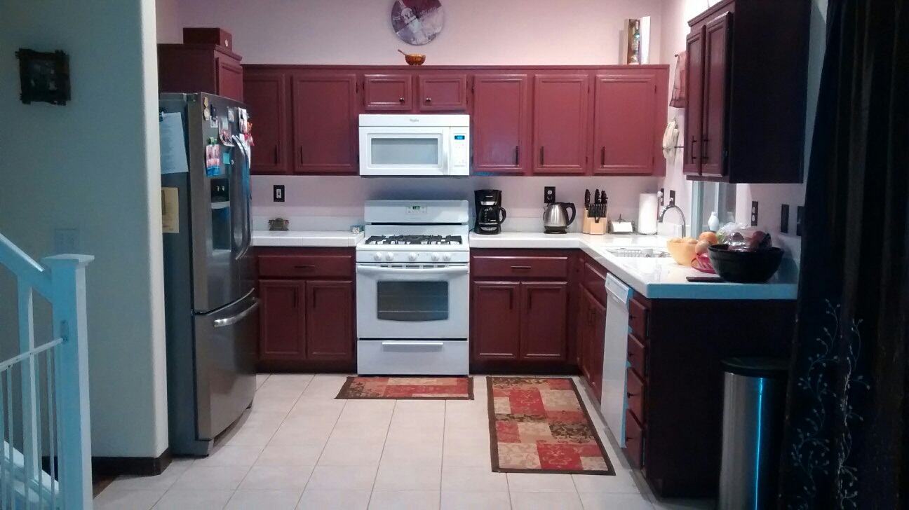 Jaxi писал(а): :d_thanx  за ответ. А краска какая-то специальная? Поставь все же фотки,если возможно. И еще, если, вдруг, дом придется продавать, лучше оставить оак кабинеты, или перекрашенные-ок? В нашем случае почти что угодно было лучше, чем оригинальные оак шкафы.  Дому 14 лет, шкафы никогда не менялись, поцарапанные и потертые. У нас еще и каунтертоп из белой плитки и белая раковина. Я даже раковину купила новую металлическую и мы хотели вырезать старую из плитки (не меняя каунтертопа) и ставить новую. Но муж как посмотрел, что там дикое кол-во бетона еще эту раковину снизу держит, он побоялся это делать. Если вдруг при попытке вырезать лопнет плитка на каунтере, нам придется весь каунтер менять, а у нас нет ни смысла, ни денег это делать. На счет продажи, я сама не люблю оак шкафы и выбрала бы что угодно другое, кроме оак, если бы снимала или покупала дом. Кухни с оак шкафами мне кажутся сильно простыми, наша очень сильно улучшилась с другим цветом. Я присматривалась к кабинетам в Lowes и мне понравились два цвета: темно-коричневый или типа бардового. Потому я решила покрасить в один из этих цветов, раз уж на нове шкафы мы решили не раскошеливаться)) Хотя если бы те же оак кабинеты были новыми или обновленными, то это смотрелось бы намного лучше... У нас был ужас. В общем, это на любителя. Мы продавать не планируем, но будем сдавать дом скоро. Менять ничего не будем, будем сдавать как есть. Краску я брала Valspar semi-gloss в Lowes. Обычная краска, ничего особенного.