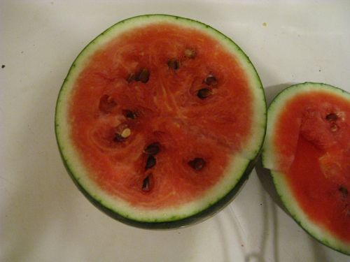 Кaвун и его кaвуниха. Ковуниху зарезала сейчас, сладкая , хотя и не ярко красная, но семечки черные уже.