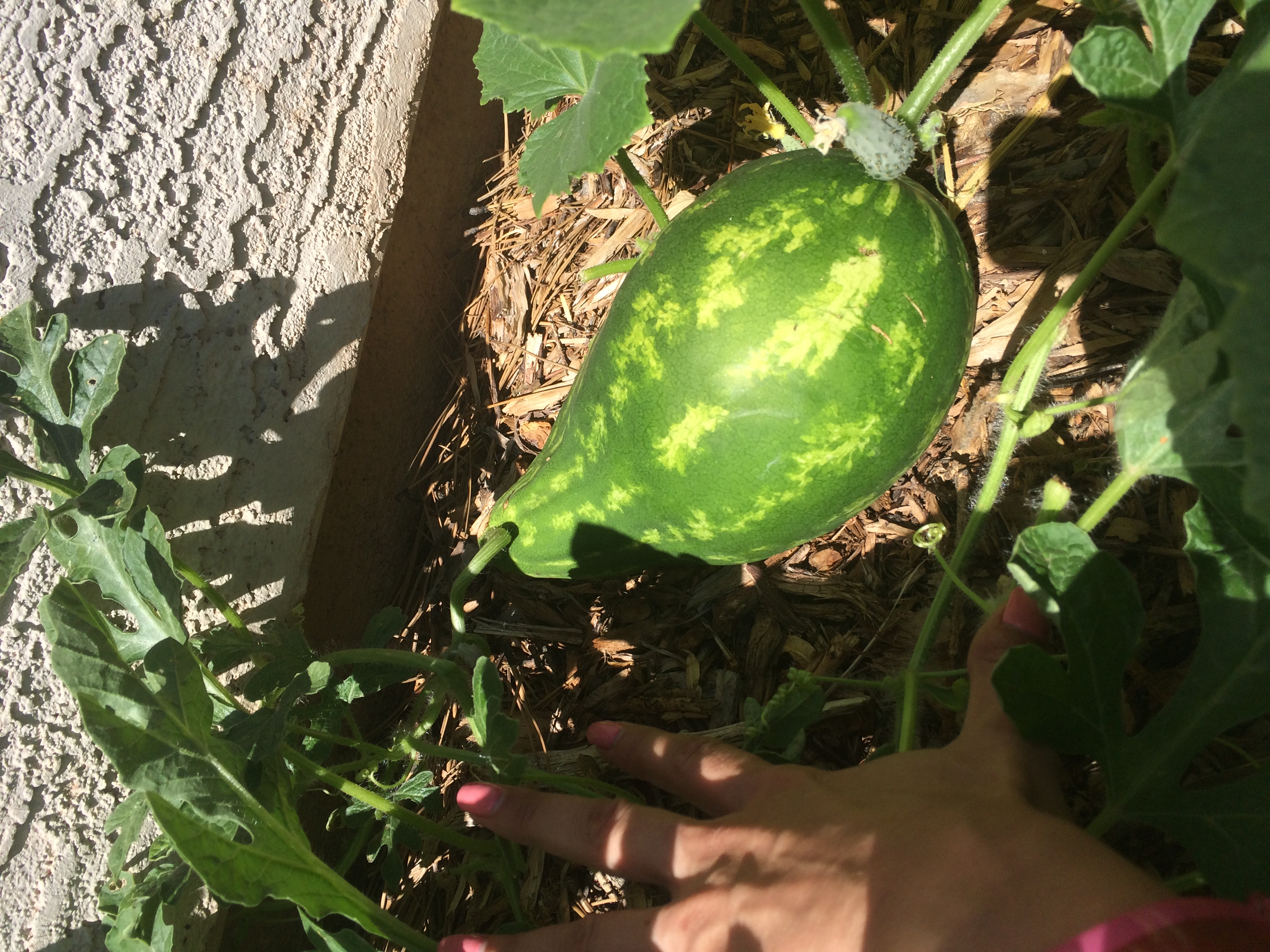 Ещё нашла арбуз Шуга бейб. Его зажало между стеной и землёй. Кое-как его оттуда вытащила (ещё до отъезда). Белым пятном наверх, иначе не получалось. Теперь его белое пятно полностью загорело, и это за 10 дней.