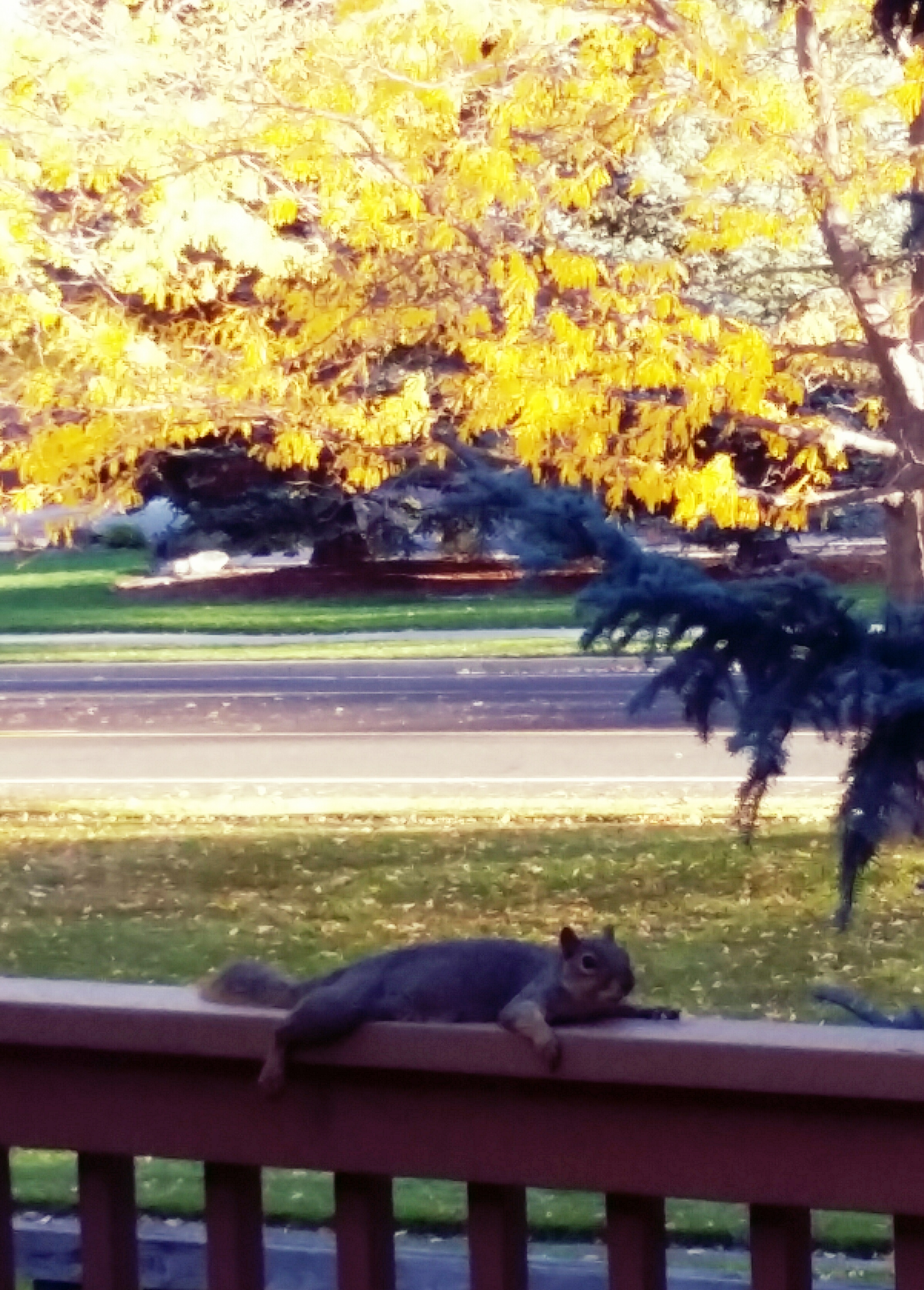 Сегодня день был теплый, белка разлеглась на деке, попуГАИ белок не видели