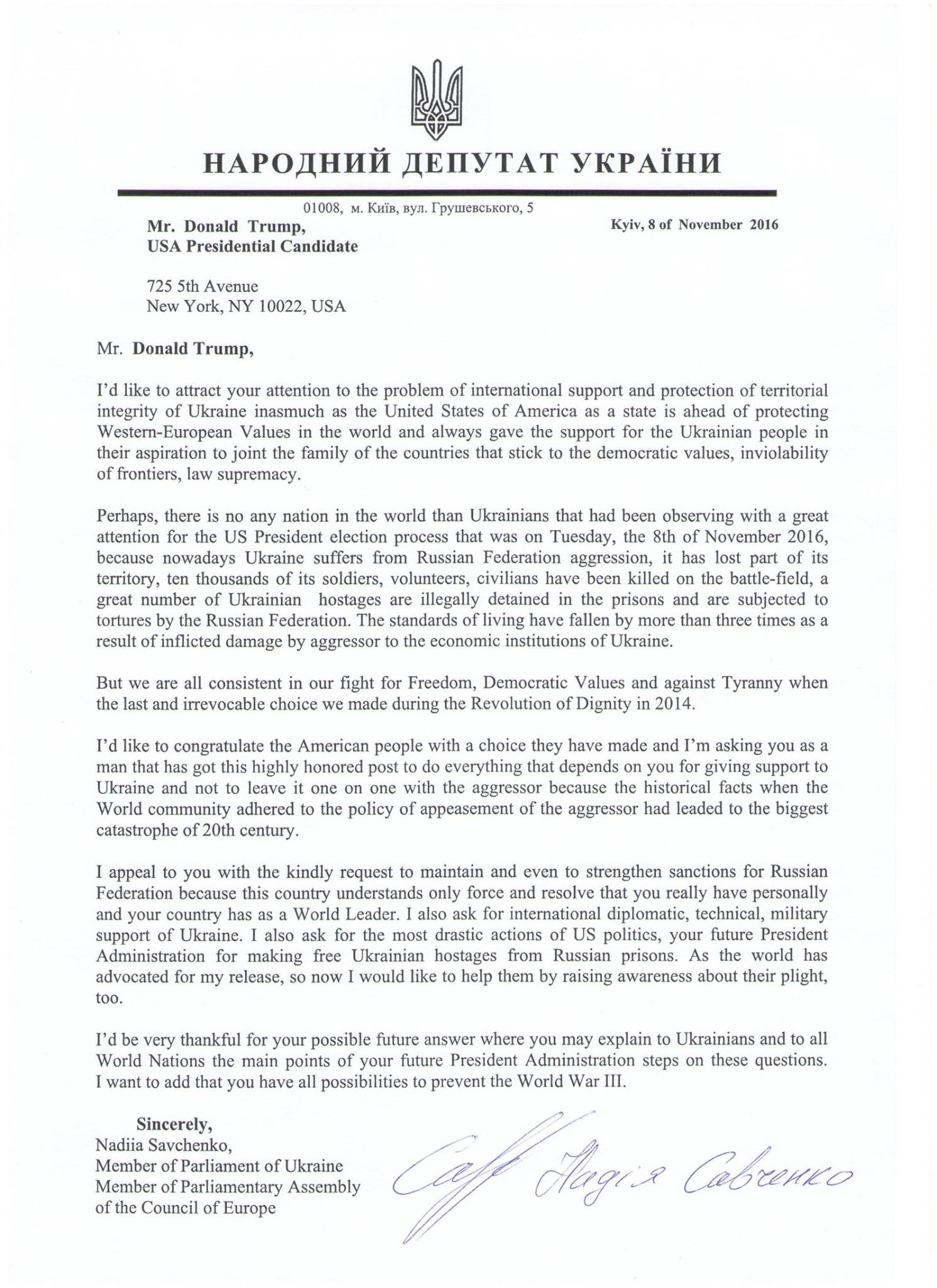 Савченко написала письмо Трампу о санкциях против РоссииЦитата: Депутат Верховной рады Надежда Савченко написала открытое письмо избранному президенту США Дональду Трампу. Копию документа она разместила на своей странице в "Фейсбуке". https://life.ru/t/%D0%BD%D0%BE%D0%B2%D0 ... tiv_rossii
