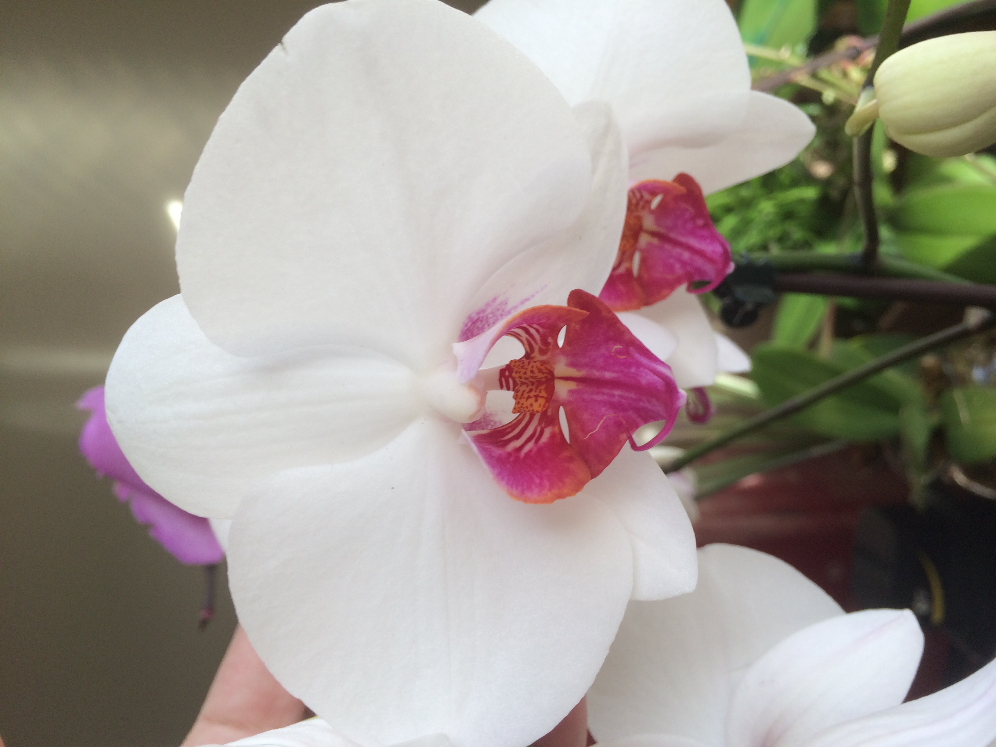 Сходила называется за хлебушком. Поехала в Ловс, купила ещё 2 орхи, обе белые. Белые у меня есть, но устоять не смогла, состояние шикарное. А ведь ехала за полками для орх, а то уже ставить некуда. На обратном пути заехала в Крогер за яичками, а там она - давняя хотелка по 15$. Не верю, что пишу это, но она тоже белая. Но с малиновым клювом! Пройти не смогла. Про яйца забыла. Ну и ладно, кашку поем. Вот она моя красавица.