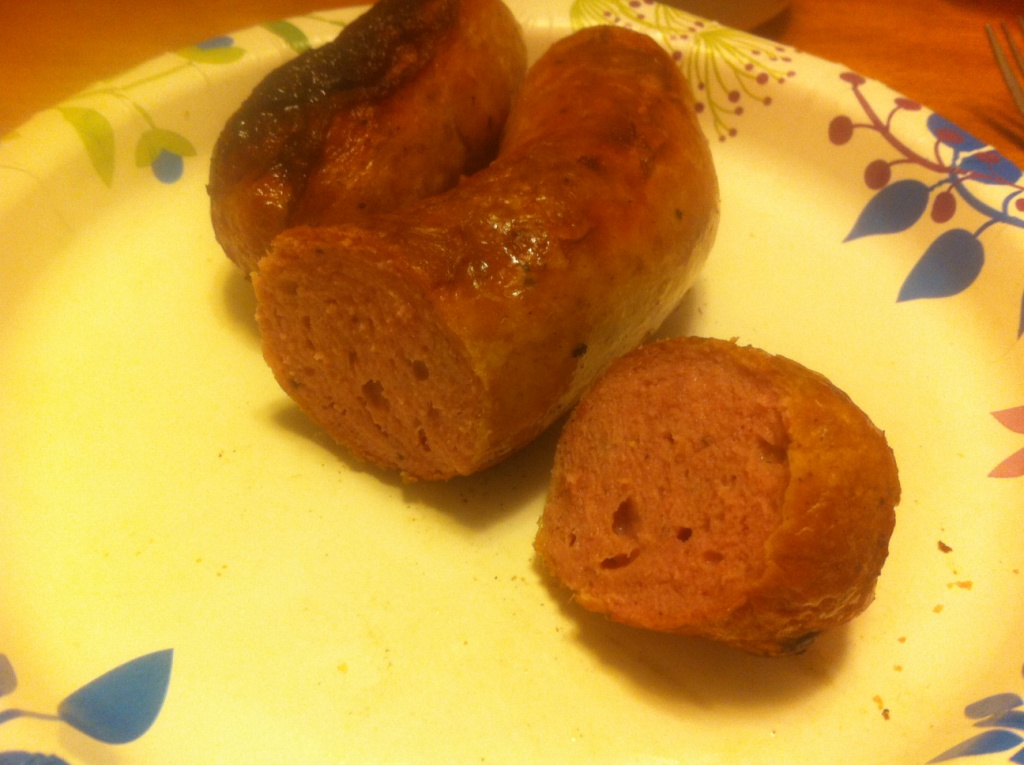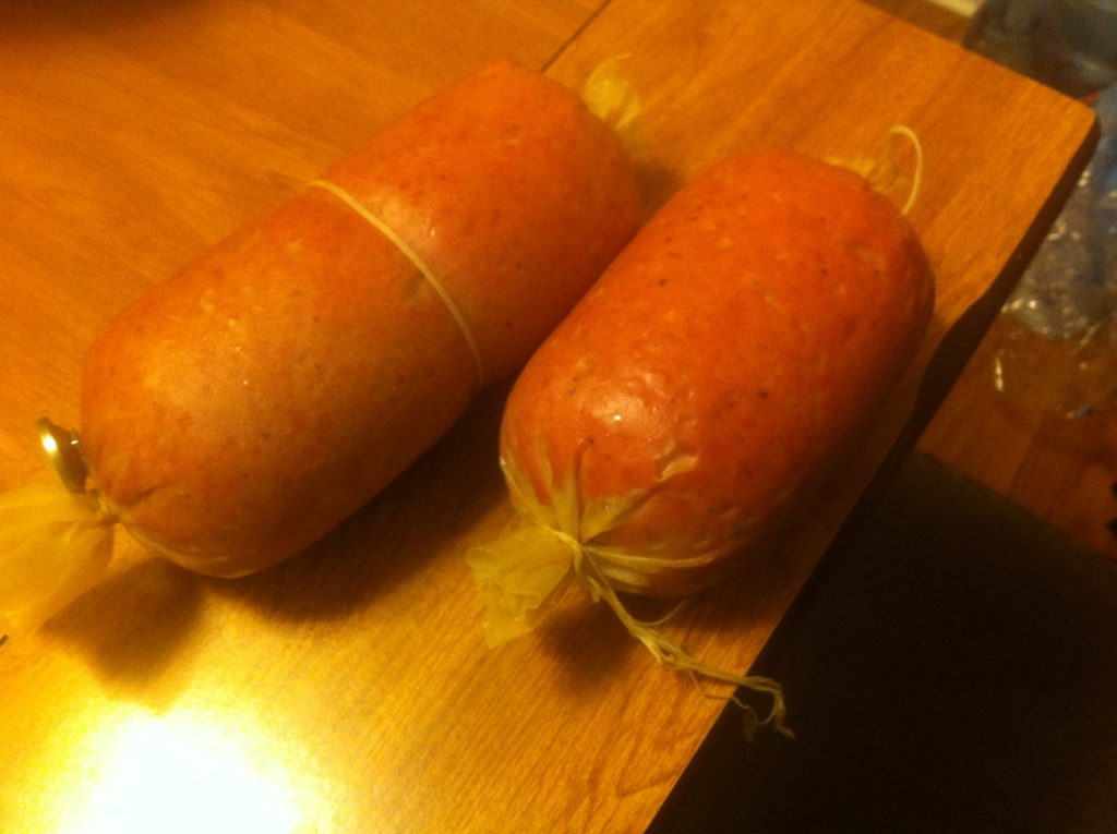 Теперь колбаса докторская. Будем резать завтра утром, покажу срез. После запекания в духовке при 155Ф в течение 3 часов, наверное, я ее охладила под проточной водой, немного в морозилке, а потом уже в холодильник перенесла.