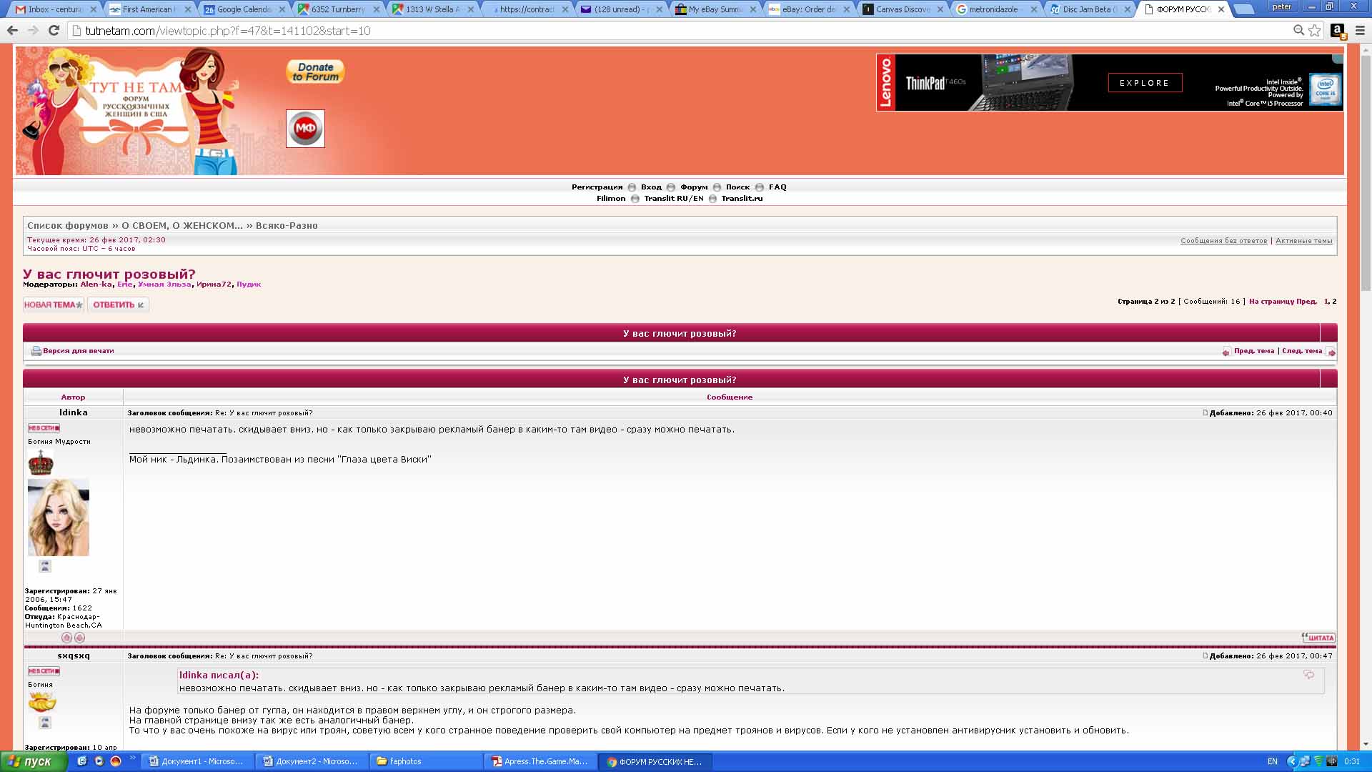 Nicole+ писал(а): Nicole+ писал(а): sxqsxq писал(а): что значит "выбрасывает" - вы открыли форум, щелкнули на "ответить" страница должны перезагрузиться и на ней должно быть то что я приводил как пример. У вас что? на каком шаге выбрасывает и куда выбрасывает? открывается что-то? вообще окно с форумом закрывается? или .... Нажимаю «ответить», появляется окно для печатания, начинаю печатать- не печатается,или печатается экстремально медленно и в какой-то момент (сразу, вначале печатания или при попытке отправить сообщение)окно самозакрывается и меня выкидывает туда откуда пришла, т.е. в тему форума, куда пыталась сделать коммент. Вот сейчас опять такое, печатают вам в Word, потом копирую и помещаю, но даже после этого иногда окно исчезает и тебя выкидает в форум...щас попробую отправить это, напечатанное в Word сообщение. PS Когда начинаю печатать буква не выскакивает сразу, т.е. заедает,жду-пожду пока выскочит, потом другую также...а когда быстро печатаю, вернее в обычном темпе, сразу выбрасывает или спускается вниз. Попробуйте после открытия страницы где вы вводите текст немного подождать и ничего там не делать, пока загрузится все содержимое. Может действительно гугловский банер блокирует работу окна, пока загружается его содержимое.