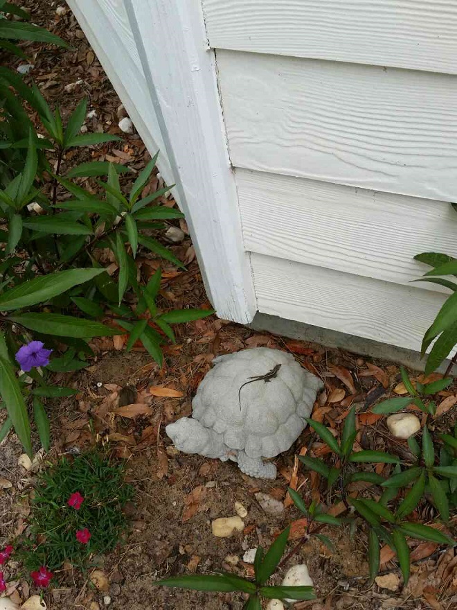 А вот ящерка вообще не парится... разлеглась на черепахе и позирует Листья там какие-то горят... пересаживать полклумбы надо... акуна матата, короче