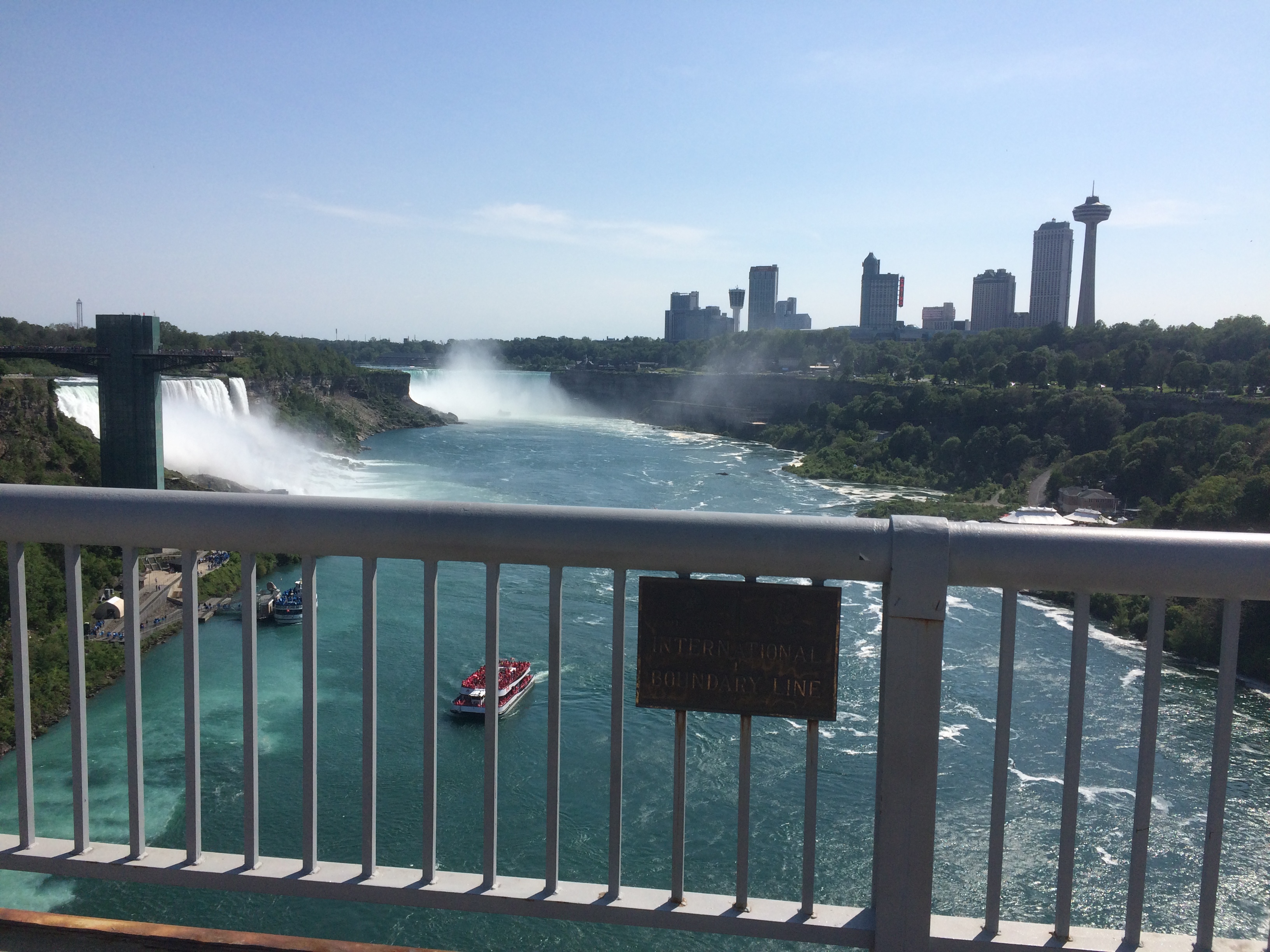 Сегодня на Ниагаре. Вид с моста Радуги. Левая нога в США, правая в Канаде.  На табличке написано: "International Boundary Line". Чтобы посмотреть на водопад с обеих сторон, пришлось перейти две границы в течении часа.
