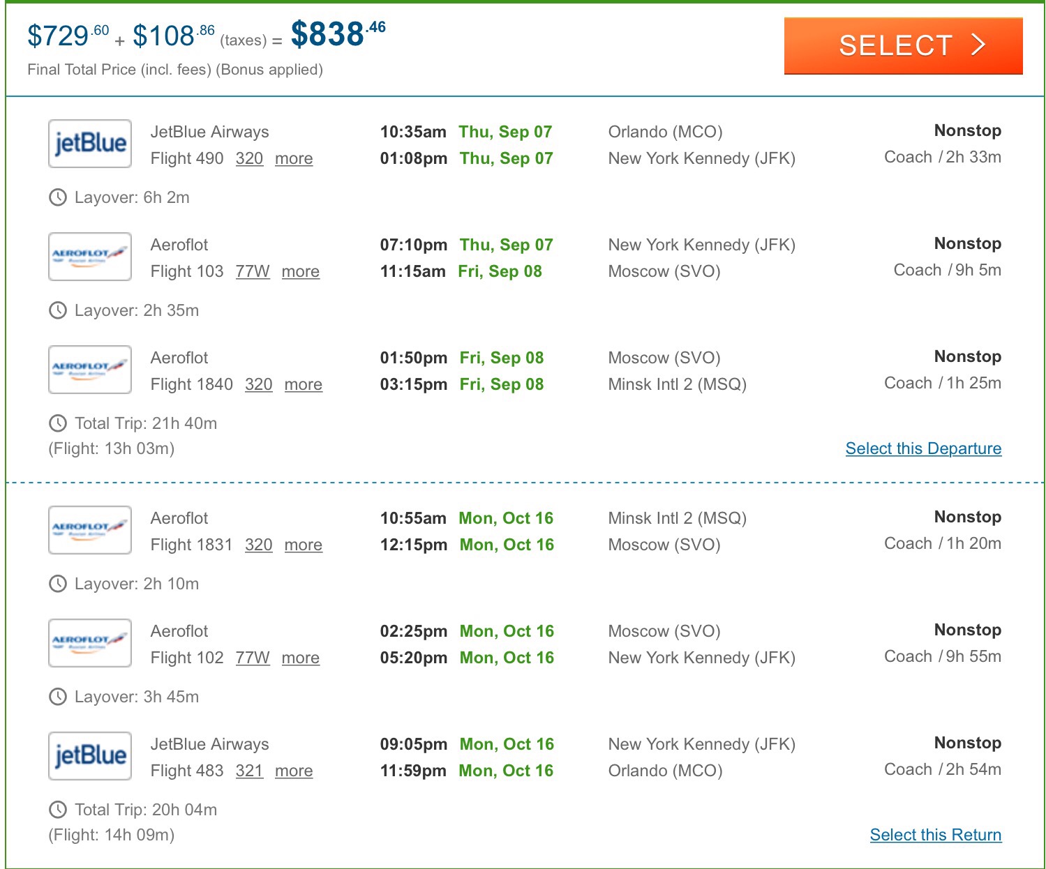Olia2015 писал(а): Я сейчас ищу билеты на сентябрь, Орландо-Минск и обратно. Смотрю цены на сайтах агенств (cheapoair.com, air.flightsbank.com), вроде не дорого, а потом когда перепроверяю цену на сайтах самих авиакомпаний, цены в два раза выше. Почему такая разница? там еще таксы сосчитайте. У дешевых потом все приплюсуется. Мне кажется разница небольшая. Чем больше будет разница во времени м/у самолетами, тем дешевле билеты. И конечно время, ночью всегда дешевле или рано утром. Мы всегда на vayama покупаем. Никогда не летала аэрофлотом, а последний раз за 550 долл на СПб через Москву. Очень понравился сервис, и везде во время. И время нормальное было Я обычно покупаю , чтобы время м/самолетами впритык, рискую, но что поделать:)