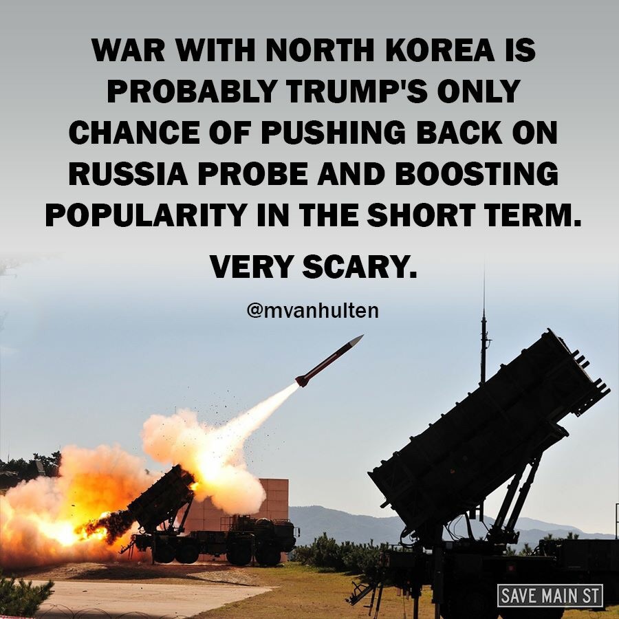 Nicole+ писал(а): IzaStar писал(а): Само собой, на руку. Маленькая победоносная военная риторика для президента всегда в плюс рейтингу. Объединение партий из-за корейской проблемы вряд ли поможет Трампу повысить его рейтинг,который сейчас достиг самого низкого показателя в истории президенства США - 36%. Поиск внешнего врага всегда являлся способом отвлечь аудиторию от внутренних проблем. А тут и искать не надо, достаточно перейти к "горячей фазе" (ну, или словоблудию об этой фазе). Цитата: Превентивный удар по КНДР может стать для Трампа успешным выходом из политического кошмара с импичментом и расследованием связей с РФ. В ситуации, когда вокруг президента США Дональда Трампа сгущается политический кошмар, а его коллеги по Республиканской партии уже обсуждают в кулуарах возможность смены власти в Белом доме, называя кандидатуру преемника, выходом из сложившейся ситуации для Трампа может стать превентивный удар по Северной Корее.