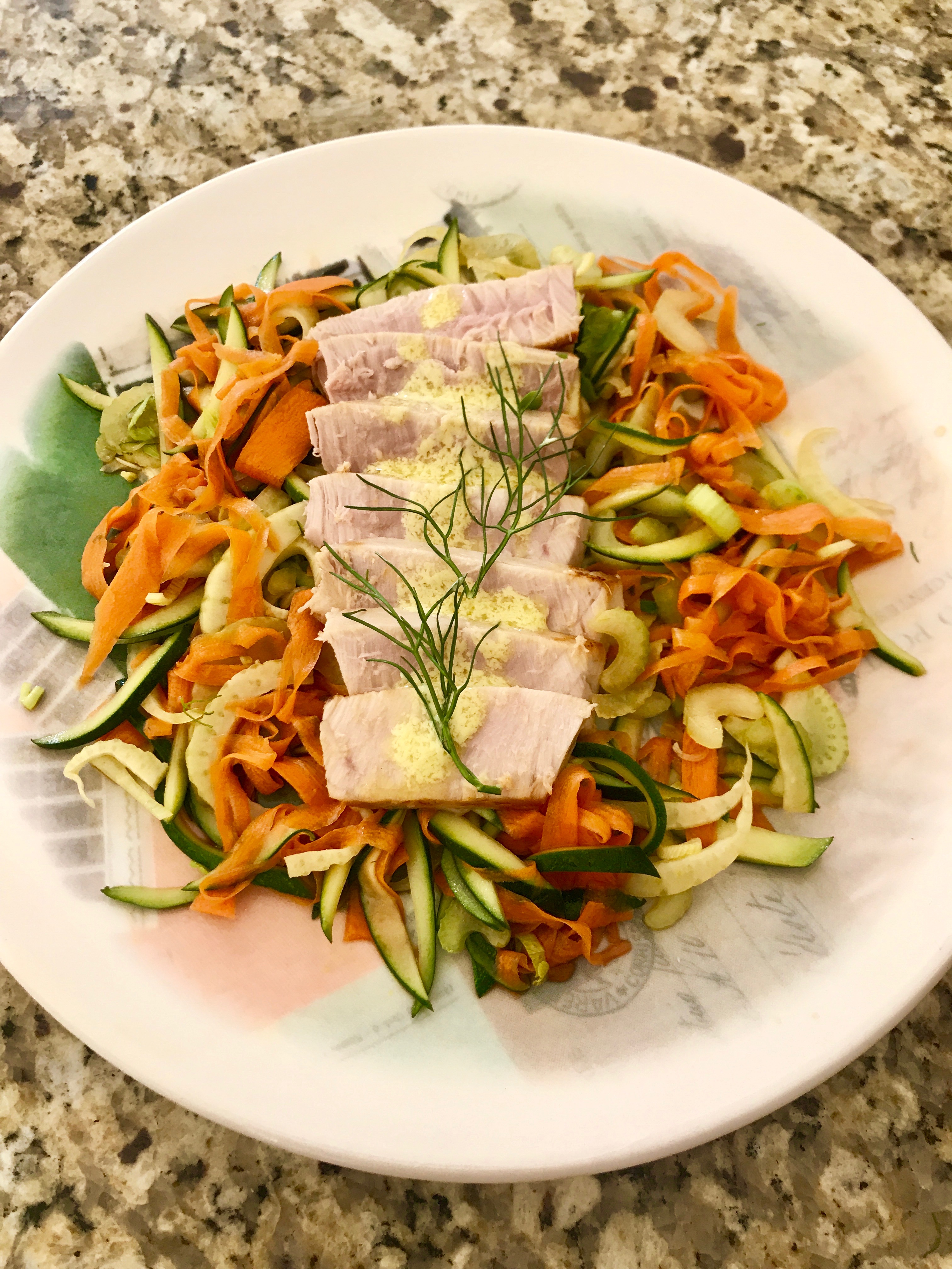 Выложить на тарелку овощи, сверху тунец. Я еще делала майонез с вассаби для тунца, просто несоклько капель. желок+лимон 1/2+васаби, взбить и потихонько ввести масло оливковое
