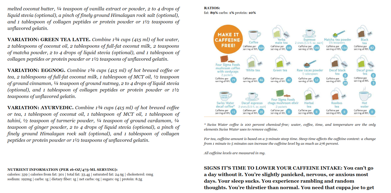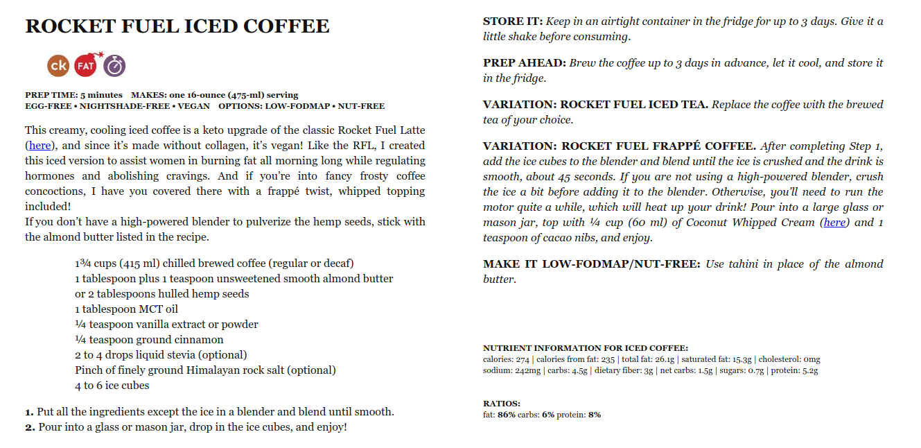 Вот еще такой рецепт кофе, он у меня идет вместо завтрака. Это из книги Leanne Vogel "The Keto Diet: The Complete Guide to a High-Fat Diet, with More Than 125 Delectable Recipes and 5 Meal Plans to Shed Weight, Heal Your Body, and Regain Confidence" https://www.amazon.com/gp/product/B06XK ... UTF8&psc=1 Так же она утверждает: Цитата: "As long as it's under 10g of protein and 3g of carbs, it shouldn't break your fast." поэтому этот кофе должен хорошо вписатьсе дле тех, йто делает intermittent fasting. п.с. только я делаю вариант "горячий кофе", не люблю холодный!