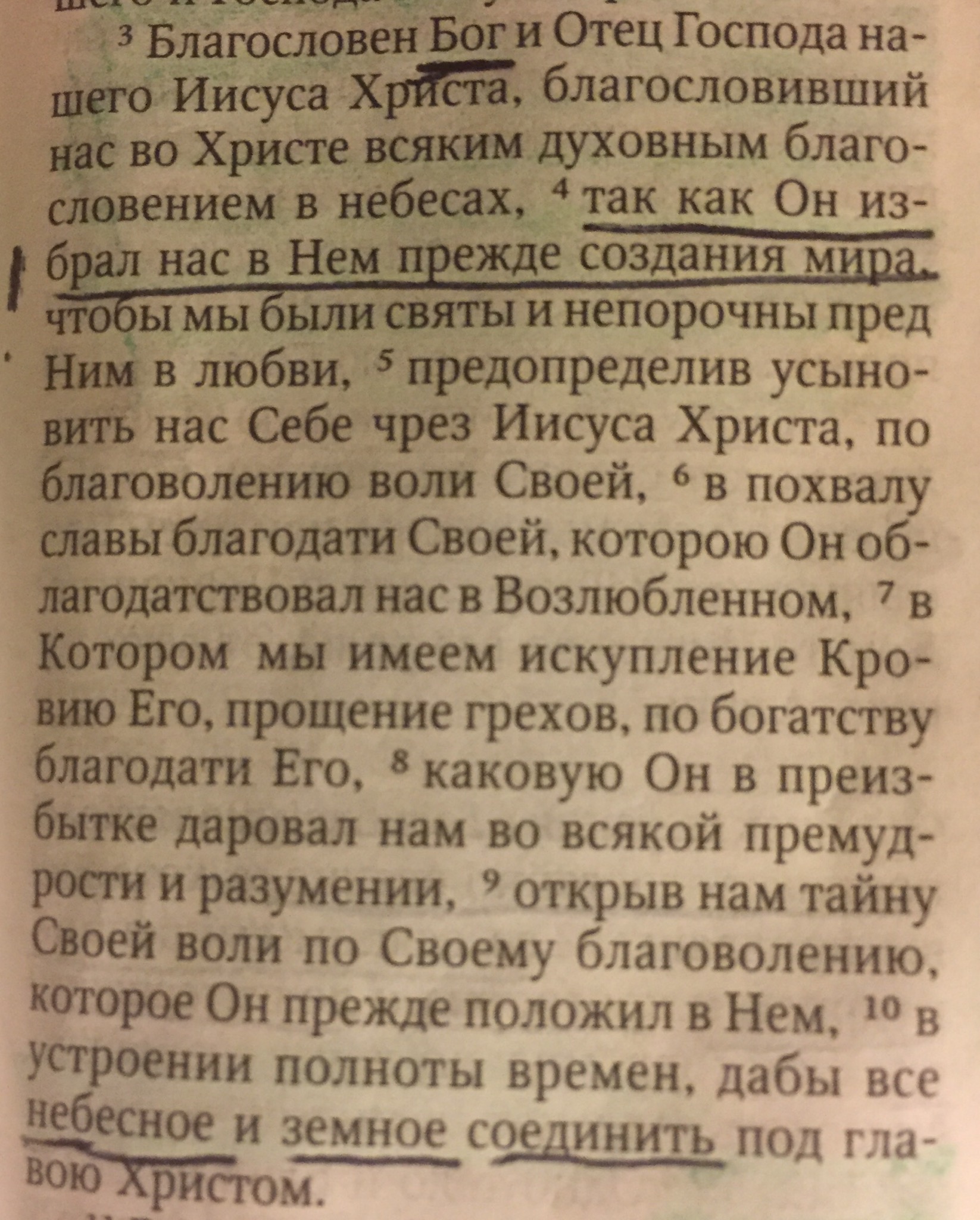 А вот тут ( это Ефесянам) -что мы избраны еще до создания мира. ( материального) . То есть мы существовали уже до прихода на землю.