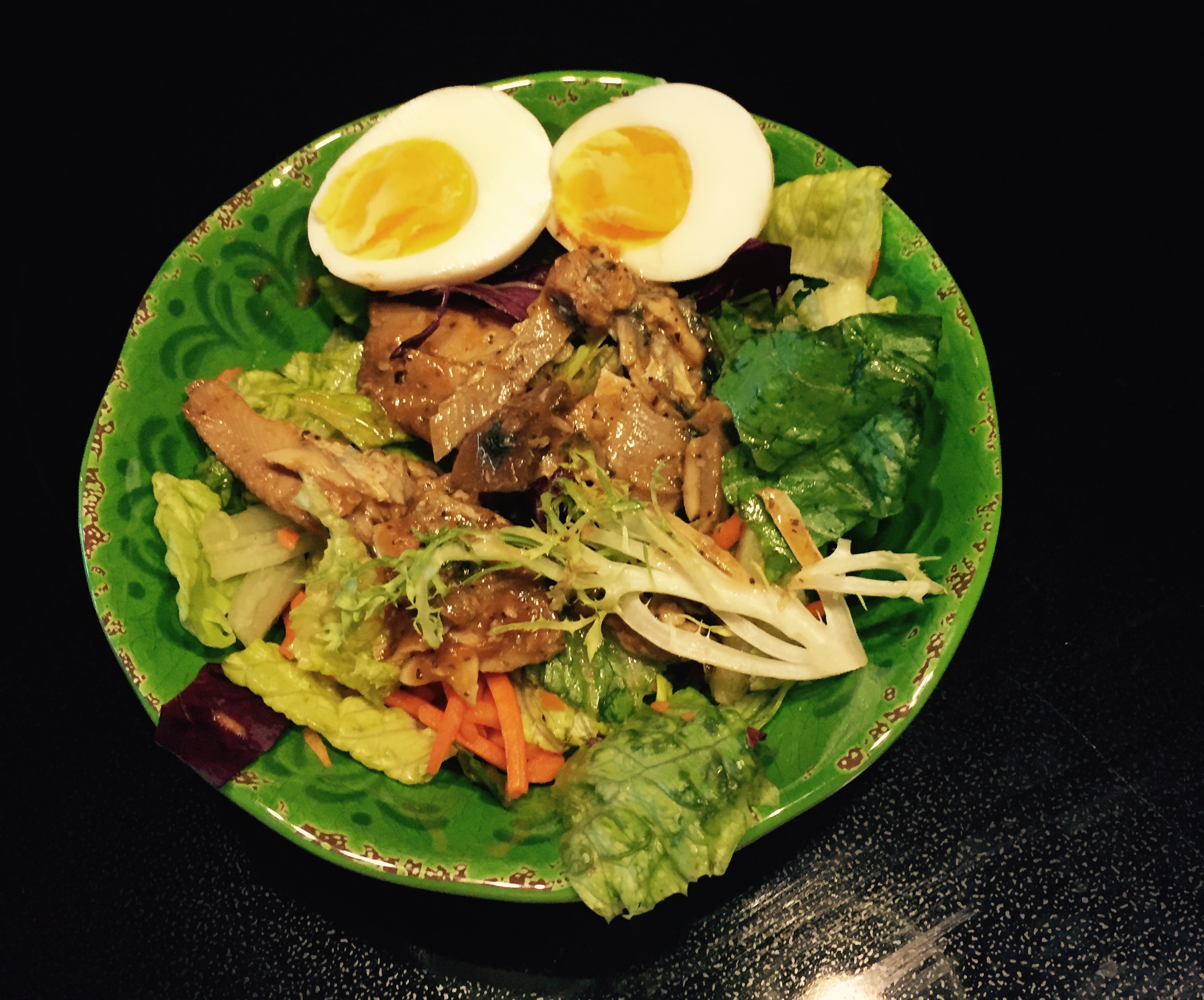 Мой ужин сегодня, семья другое ела. Смесь листьев салата, селёдка в томатно-базилик соусе и яйцо варёное. Соус и специи не нужны тк соус от селедки.