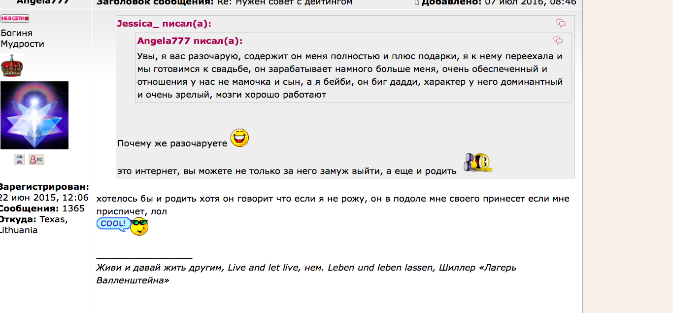 Angela777 писал(а): Bytheway, я думала, что вы шутить или булить любите, но похоже у вас диагноз, чтобы вот так прийти на форум и все ваши сообщения с наездами только на меня, незнакомого вам человека? Столько времени тратить читая 2 года назад мои посты, хммм занятное вы себе дело нашли, надеюсь вам за это платят или думаете меня на нервы развести и о радость, поесть вдоволь энергии зла и зависти! Вы вампирить любите, со мной это не получится, мне вас жаль. Диагноз у тебя, вот решила помочь), обозначить проблему, собрала твои галлюцинации и эротический бред в одном месте , наглядно показать , так сказать Вампирить из вас нечего , да и заразиться можно  Ага, платят  Надо Админу в 12 ночи позвонить , попросить , чтобы не забыла деньги отправить